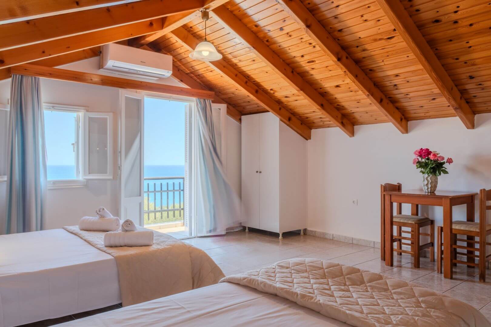 Our studios and suites are designed for comfort, featuring bright, airy spaces with private balconies that capture the stunning scenery. Guests can enjoy modern amenities, including air conditioning, a well-equipped kitchenette, and complimentary Wi-Fi. Whether you’re here for a romantic getaway or a peaceful family vacation, you’ll find everything you need for a memorable stay.